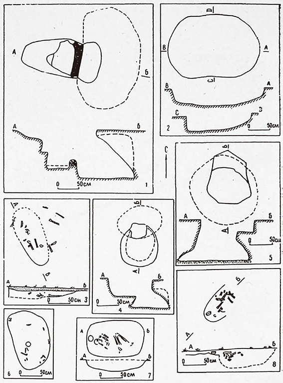 扎曼巴巴墓地位于卡拉库尔区西北15千米处,位于扎曼巴巴湖的北岸。1950年在湖北岸考察古贾里(Гуджайли)河道时,偶然采集到被毁坟墓中的人骨和遗物。随后选择发掘1个小土丘的北半部,发现了7座墓葬。1951年、1953年、1961年和1964年继续开展发掘工作。在5个季度的田野工作中,发掘572平方米,共40余座墓葬。[1]