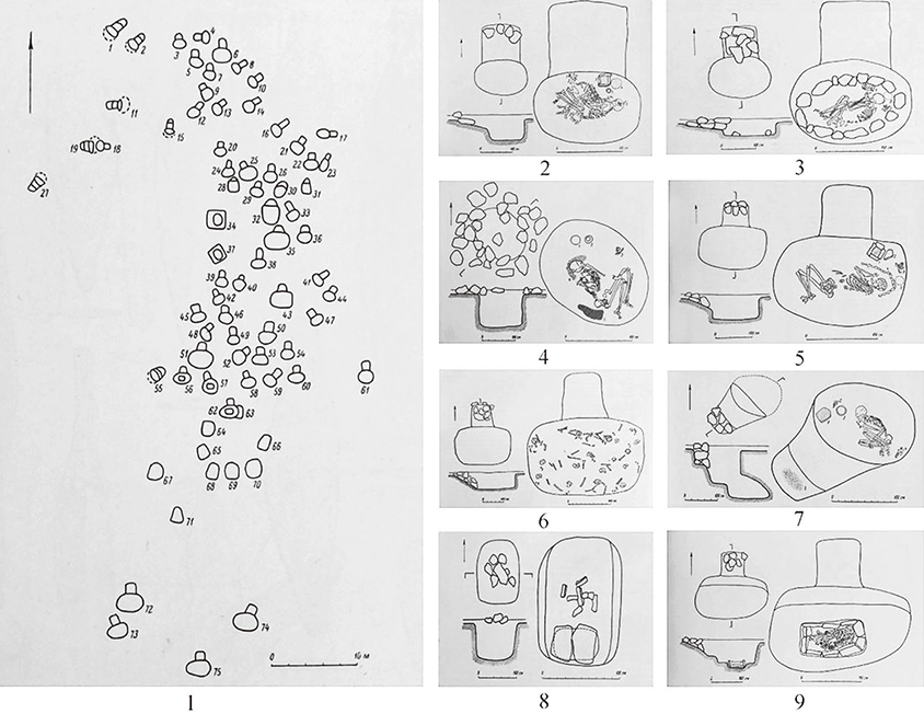 (1)带斜坡或竖穴的墓道的土坑墓。墓坑内填充黄土,斜坡墓道的入口处填充石块。斜坡墓道朝向的基本方位不固定,墓室长轴线呈东—西向占多数。人骨侧身屈肢,双臂抱肘,双腿屈膝。大部分为单人葬,葬在这类墓葬中的所有男子全部向右侧卧,面朝斜坡;而女性则向左侧卧,面朝斜坡或者背朝斜坡。8座墓葬为异性双人合葬,有的为同时葬入(M06、M20、M22、M32、M35、M43),有的则在不同时间葬入;在这种异性合葬墓中,女性始终背朝入口面向男性,在异性合葬墓中,男女死者均头朝东。未成年人墓地与成人墓地相距一段距离,有4座墓葬埋入多个儿童。这类带墓道的墓葬中有3座使用石椁葬具(如M56、M62等),在墓室底部中央位置掏挖矩形凹穴,在坑内的地面和壁上砌扁平石板围成一个石棺,石棺中葬入死者骨殖,颅骨始终置于石棺的东端,腿骨置于西端,臂骨置于中部,其余的骨殖则置于它们的下面。在石棺顶部再覆以芦苇,除个别墓葬有少量动物骨骼外,其他墓葬未见随葬品。还有9座火葬墓。这类墓葬地表用石块堆起低矮的封堆,其下为南北向浅浅的竖穴土坑,在坑南的底部挖一椭圆形凹穴,上面覆盖着扁平石板或细长石块。地面上则撒以焚烧的细小人骨、灰烬和炭。坑内置以石块,组成“卐”形,或者具有四根“辐条”的圆圈。在这些土坑中偶然也会见到一些质量很差的陶器残片。这类墓葬的随葬品包括陶器、金属制品和石器。约有70%的陶器为手制;其主要器形为壶、盘、盆。金属制品中有薄叶刀,刀的尖端部通常向外弯曲,有时还有一道中脊,此外尚有短剑、锛、具柄镜等。石器主要为少量燧石镞,此外还有各种形状的珠子。