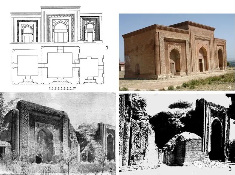 陵墓由三座砖砌建筑构成,最早的一座建于11世纪,上世纪20年代和70、80年代经过发掘和修复,通过其中的铭文了解到喀喇汗汗国在乌兹根的首领和军队领导也被葬在北部和南部的两座墓室中,他们生活在大约12世纪的中期(图三十二-三十五)。