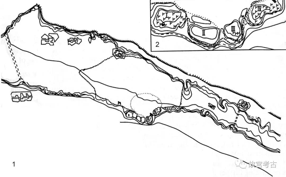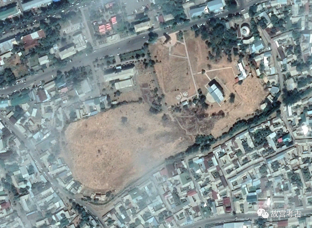 乌兹根(Uzgen)遗址位于乌兹根市中心偏南,黑河(Karadarya)河的北岸台地上,北纬40°46'7.61",东经73°17'53.61"(图二十五)。城址由I—IV号四处高台区域组成(图二十六)。其中第三座高台上的城址修筑了坚实的防御工事,起着城堡的作用,现存的宣礼塔和三座陵园位于第四座高台上,为喀喇汗汗国时期所建筑(图二十七、二十八)。乌兹根遗址把守着亚西(Yassy)河河谷的入口,通过这里进入天山的古代丝路,向北通往伊塞克湖南岸,向东通往喀什。作为丝路上重要连接点,从古到今,这里都是政治、经济、贸易和文化的交汇处(图二十九)。