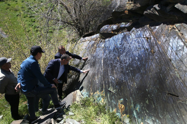 Archeologists and historians examining petroglyphs in the Zhambyl Region. Photo credit: Department of Internal Policy of the Akimat of the Zhambyl Region