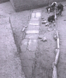 古代城址明月坝遗址明月坝遗址位于云阳县高阳镇走马村内,地处长江支流澎溪河西岸一、二级阶地上,海拔137~144米,面积约15万平方米。该遗址现淹没于长江三峡水库。该遗址于1992年四川省考古研究所开展调查时发现。在三峡工程文物保护工作中,四川大学历史文化学院从2000年至2003年四次发掘面积2.7万平方米,共清理出唐、宋、明、清时期建筑遗迹80余座,清理出灰坑60座、土坑墓葬58座、瓮棺葬27座、道路22条、沟13条、祭祀遗迹2处。其中唐代建筑尚存石结构部分,有台基、门道、墙基、柱础石、磉墩、散水、排水沟等遗迹。出土唐代双耳四系罐、盘口壶、盘口罐、缸、盘、灯、坛、碗、钵、碟、俑、动物模型等各类瓷器,这些瓷器分别是唐代长沙窑、黄堡窑、越窑、定窑等窑口的产品。另有大量莲花连珠纹瓦当、板瓦、筒瓦、勾滴、兽面纹檐首、鸱吻、虎纹方砖、铜石佛教造像、“开元通宝”“乾元通宝”、卜甲等。明月坝遗址唐代石板路发掘现场(摄于2000年)根据出土大量的唐代建筑构件、瓷器和钱币来看,明月坝遗址是三峡地区一处重要的唐代城镇遗址。通过对明月坝遗址平面布局和重点建筑遗存的发掘,首次从考古学上找到了唐初江边小“市”发展成设有官署衙门的“镇”的实例,填补了西南地区在唐代大型遗址或区域中心研究方面的空白。从明月坝遗址的建筑规模、布局来看,它曾经是澎溪河流域的经济文化中心,是长江沿岸各地通往澎溪河上游——开县等地的中转站。