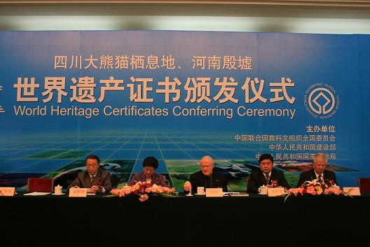 国务委员陈至立出席仪式,并与联合国教科文组织世界遗产中心主任班德兰共同向四川、河南两省颁发了世界遗产证书。