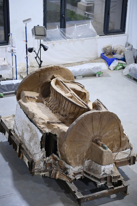 这是在陕西省考古研究院文物保护实验室拍摄的瓦窑沟墓地M3号墓出土的双辕车(2025年12月12日摄)。新华社记者 李一博 摄
