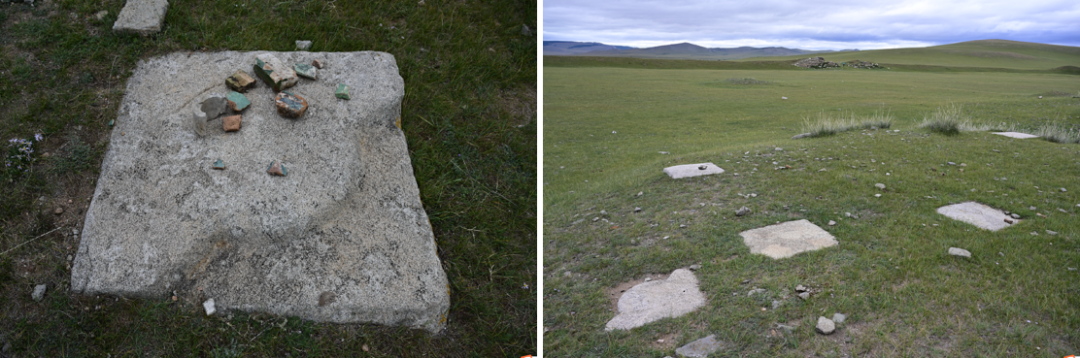图7 哈拉呼勒可汗古城大型夯土台顶的柱础和绿琉璃瓦