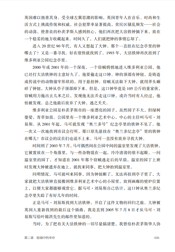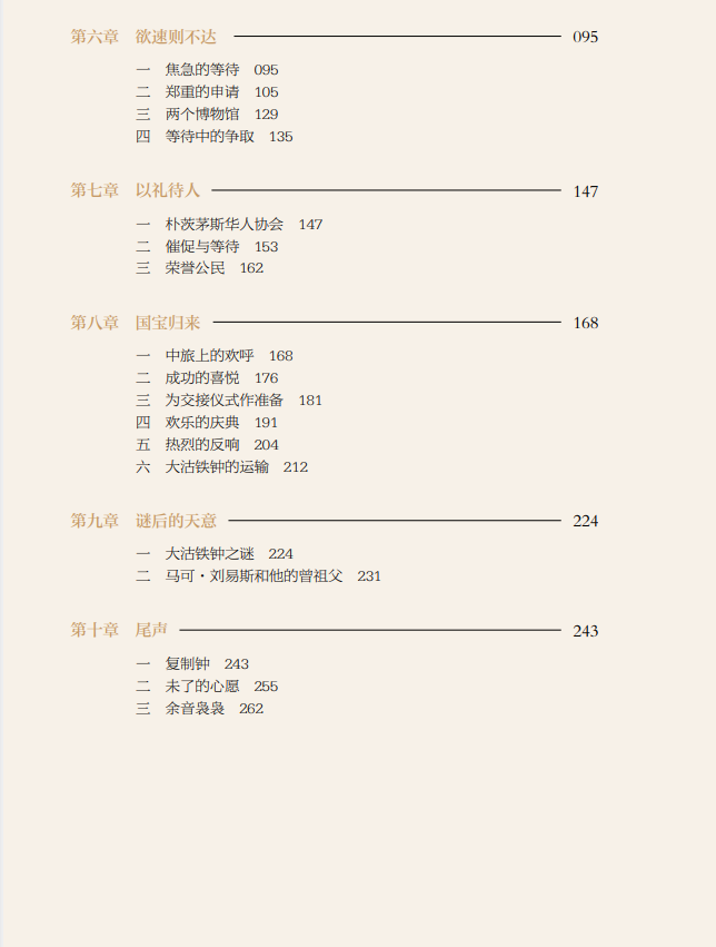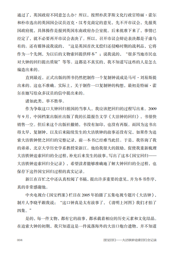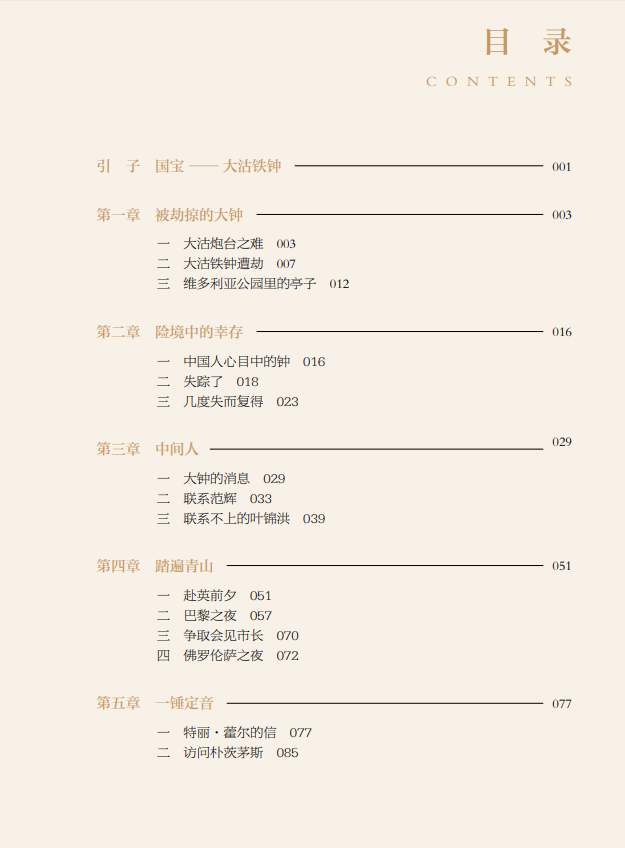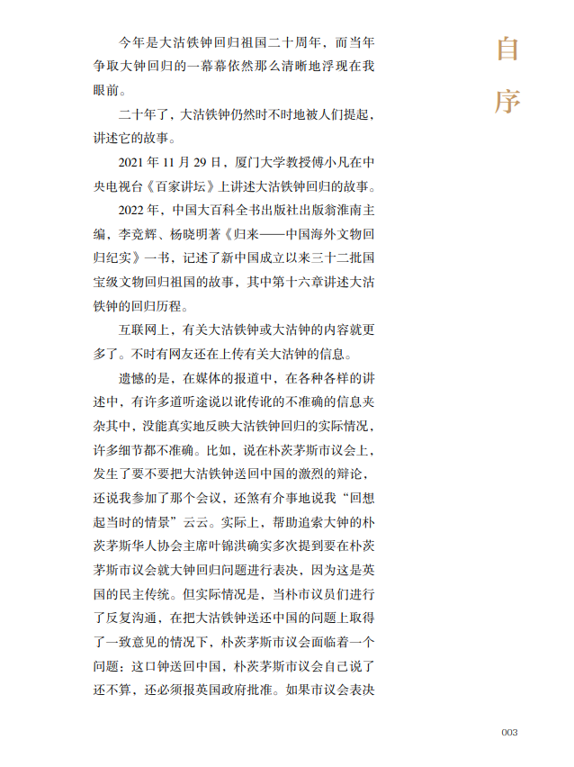 本书作者荣新海先生是当年争取大沽铁钟回归祖国的当事人。今年是大钟回归祖国二十年,他通过梳理大沽铁钟追索回归的第一手资料,记录了这件国宝回归祖国的全过程。作者在讲述大沽铁钟回归的过程中,把铁钟的命运置于世界历史发展的大背景下,体现出当代中国国家强盛、民族富强,国际影响力显著提升,引发读者的共情,增强了民族自豪感和文化自信心。同时,大沽铁钟的回归也为流失海外中国文物追索返还工作提供了一个成功范例。