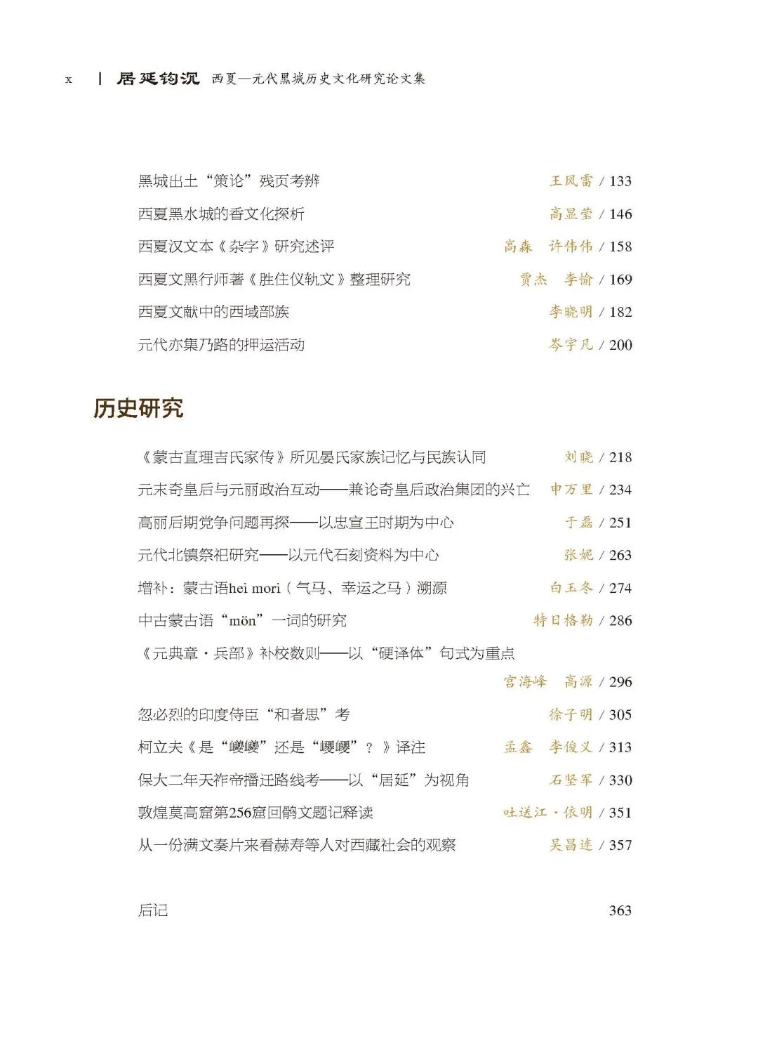 本书收录了2023 年在内蒙古自治区额济纳旗举办的“第二届居延文化学术研讨会暨西夏—元代黑城历史文化研究”的28 篇学术论文,以20 世纪初以来在居延地区发现的历代遗存为研究基础,重点聚焦于西夏至元代的考古发现与文献整理研究,揭示居延地区的社会制度、经济形态、生活场景和文化交流模式,探讨其在边疆地区治理,以及多民族融合、多文化交流、多宗教共存等方面的历史意义和作为重要文化遗产的价值。居延遗址作为中国北方草原地带的重要历史文化遗存,其丰富的文化内涵和多民族交融的历史背景为研究中华民族共同体的形成与发展提供了关键线索。