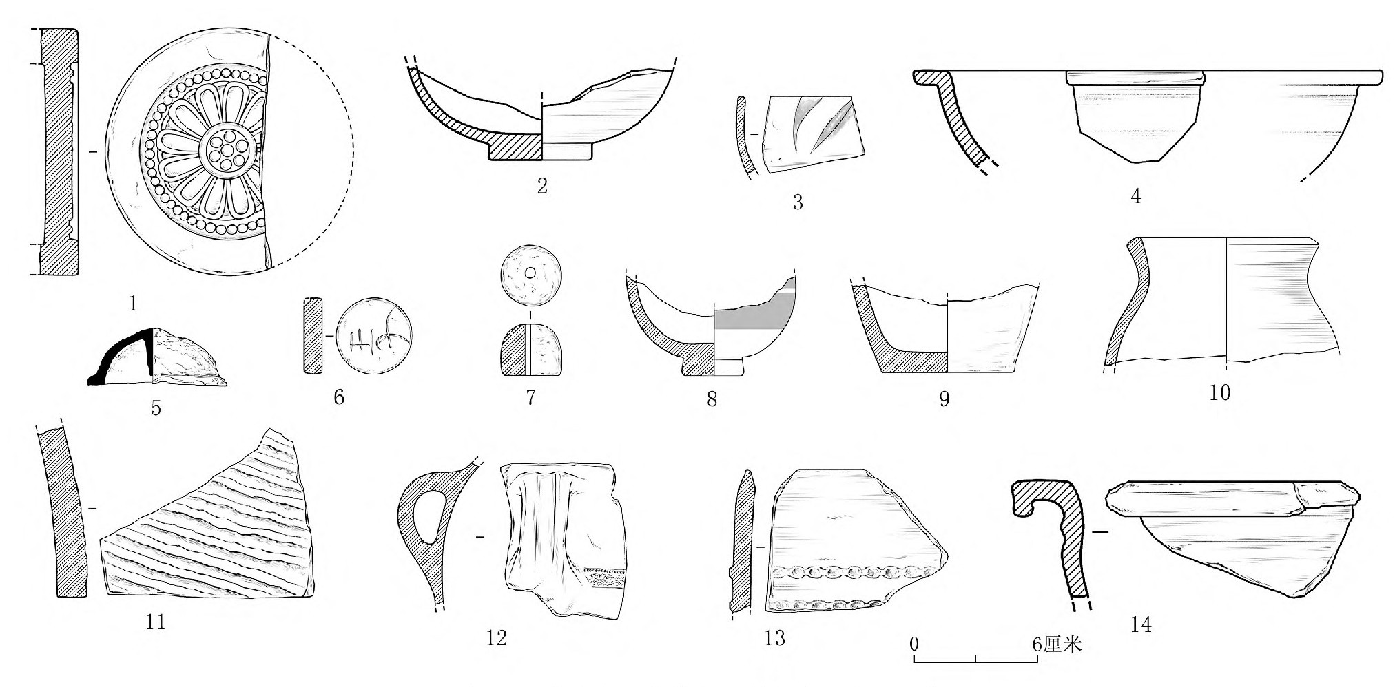 陶器2件。均为口沿残片。标本H1∶4,泥质灰陶,模制。花边口沿,沿下饰附加堆纹。残长8.75、残宽6.8、厚0.9厘米(图一六,13)。