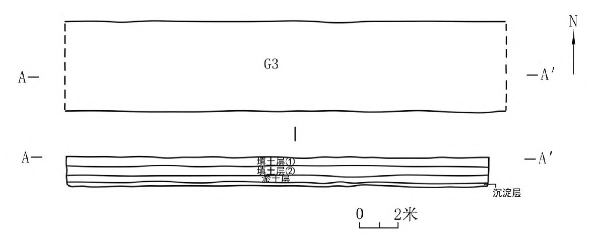 1条。位于通轨坊南坊墙北侧、呈东西向分布,开口于唐代路面下。距离Q1北壁仅0.9米。G2平面呈长方形,剖面呈敞口U型,底部西高东低,南北口宽2.3、底宽0.5、东西残长约69.7、残深1~1.15米(图一四)。沟内填土为淤土,经解剖沟内堆积可分为四层,土质较致密,内夹杂有陶器残片及残瓦片。