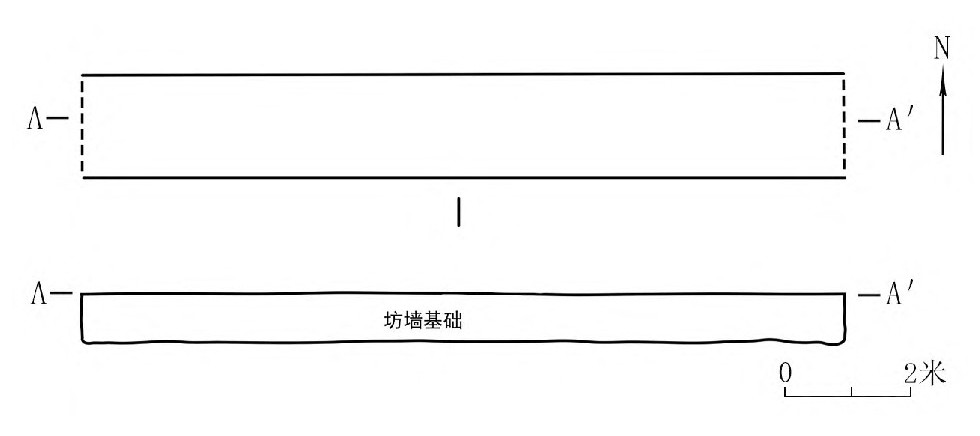 墙基内夯层不明显,局部有明显夯土块。墙体已早期破坏无存,局部发现有明显夯土块堆积。高约0.08~0.1米。墙体底部有明显加宽迹象,应该是起到稳固与防水的作用。