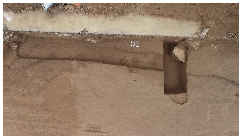 - 沟(G2):东西向,位于通轨坊南坊墙北侧(距Q1北壁0.9米);开口于唐代路面下,平面长方形、剖面敞口U型(底部西高东低);南北口宽2.3米、底宽0.5米、东西残长约69.7米、残深1-1.15米;沟内淤土分四层,含陶器残片、残瓦片