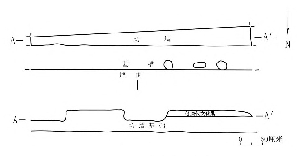 - 通轨坊南坊墙墙基(Q1):位于第十二横街以北,开口于唐代文化层下;仅存残段(东西向),深褐色土夯筑(土质致密、底部较平);中部被原游泳池(东西宽约24.5米)破坏,东西残长约69米、宽1.6米、残高0.7米;墙基夯层不明显,局部有夯土块堆积(高0.08-0.1米),底部有加宽(起稳固、防水作用)