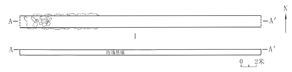 归义坊北坊墙位于第十二横街南部,开口于唐代文化层下。现仅存墙基部分,残段东西向分布。北距L1较近。归义坊北坊墙墙基(Q2)系深褐色土夯筑而成,土质致密,底部较平,局部有明显夯土,破坏严重。东西残长约5、南北残宽0.2~0.4、残高0.4米(图七)。
