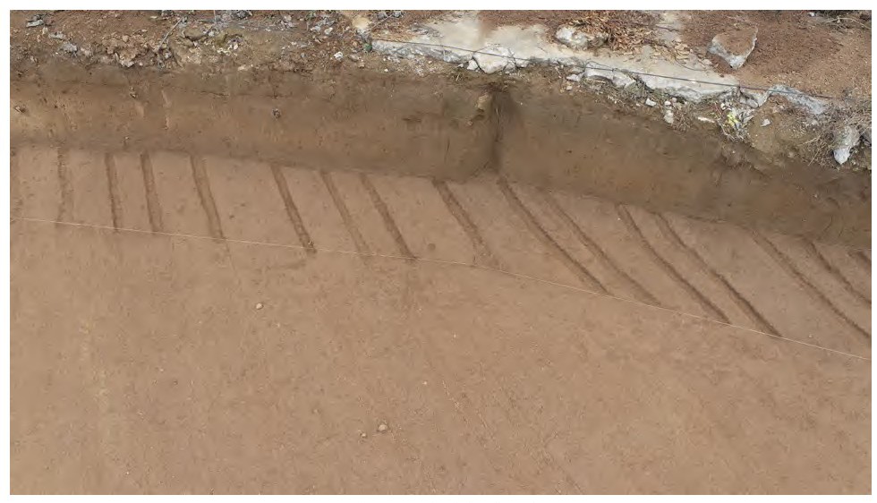 L1表面发现大量东西向车辙,未见向坊内延伸的迹象,车辙印记比较密集,有反复碾压痕迹,均开口于唐代文化层下,且保存较好。车辙直径0.12米,碾压深度0.08~0.1米(图三)。