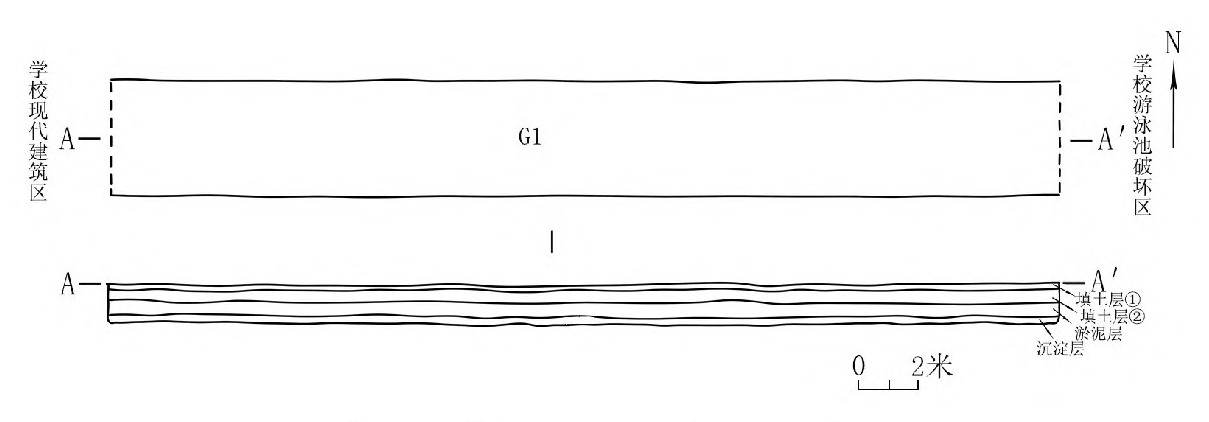 G1位于第十二横街以北、Q1以南,距离Q1南壁约5.7米。开口于唐代路面下。平面呈长方形,剖面近U型,上宽下窄,底部西高东底,南北口宽2.2、底宽0.5、东西残长约69.8、残深0.9~1.1米(图四)。沟内填土为淤土,经解剖沟内堆积可分为四层,内夹杂有陶器残片及残瓦片,另出筒瓦(残)、板瓦(残)和铜钱。