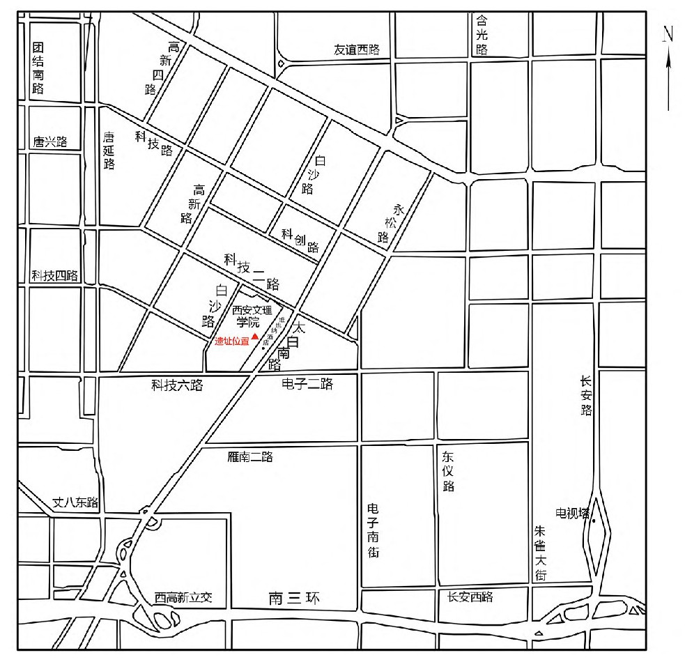 隋唐长安城第十二横街遗址位于隋唐长安城通轨坊与归义坊之间中部略偏东的位置,即在今西安高新区西安文理学院内部,太白南路以西、白沙路以东、维也纳酒店高新店以北、科技二路以南(图一)。2024年,西安市文物保护考古研究院配合西安文理学院产教融合实训中心建设项目,在西安文理学院高新校区内进行考古发掘。本次发掘揭露出隋唐长安城第十二横街路面、车辙、排水沟和通轨坊南坊墙墙基、归义坊北坊墙墙基等文化遗存。现将发掘情况简报如下: