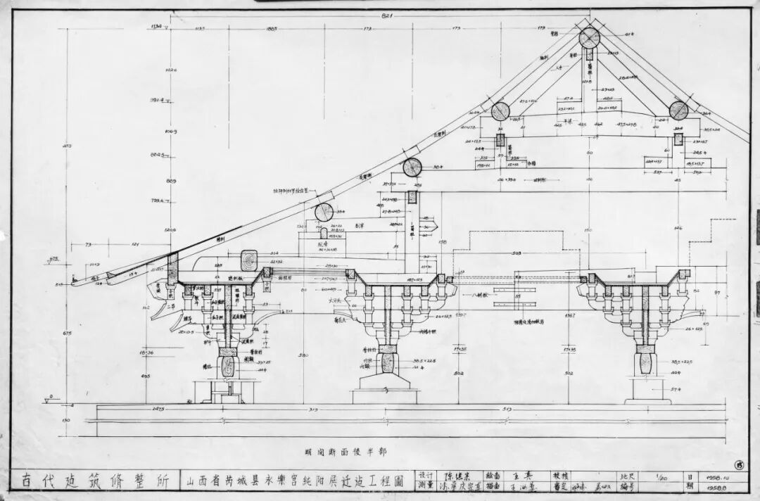 (中国文化遗产研究院藏,设计:陈继宗,绘图:王真,审定:祁英涛 姜佩文,时间:1958年8月、10月,详见:中国文化遗产研究院 查群编著《永乐宫迁建工程档案初编》,文物出版社,2020年)
