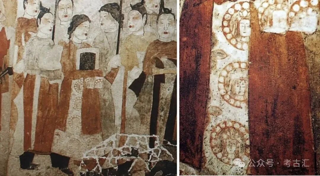 第二,九原岗墓《胡商贩马图》、娄叡墓《驼队图》、徐显秀墓《宴饮图》等图像和其墓中出土的异域器物,印证了《魏书·西域传》关于胡汉交往的史实,例如文献记录西域诸国的位置均为“去代(平城)多少里”,这一细节揭示了平城作为丝绸之路枢纽的重要地位,以及胡商与中原间贸易的繁荣景象。在徐显秀墓壁画中,马饰的联珠纹(内嵌菩萨头像)、鞍袱的波斯锦图案、胡床、胡乐器等,与墓中出土的蓝宝石金戒指(戒面雕刻希腊神话人物)等文物形成证据链,表明西域文化与商品通过丝绸之路传入中原。而《胡商贩马图》则直观描绘了马匹作为重要贸易商品的流通场景,对墓主而言,将庞大商队(如《驼队图》)带入幽冥世界,不仅是现实中民族交流的物证,更寓意将生前的贸易活动延续至地下,实现财富在彼岸世界的永续传承。