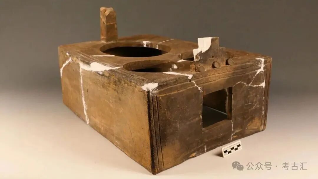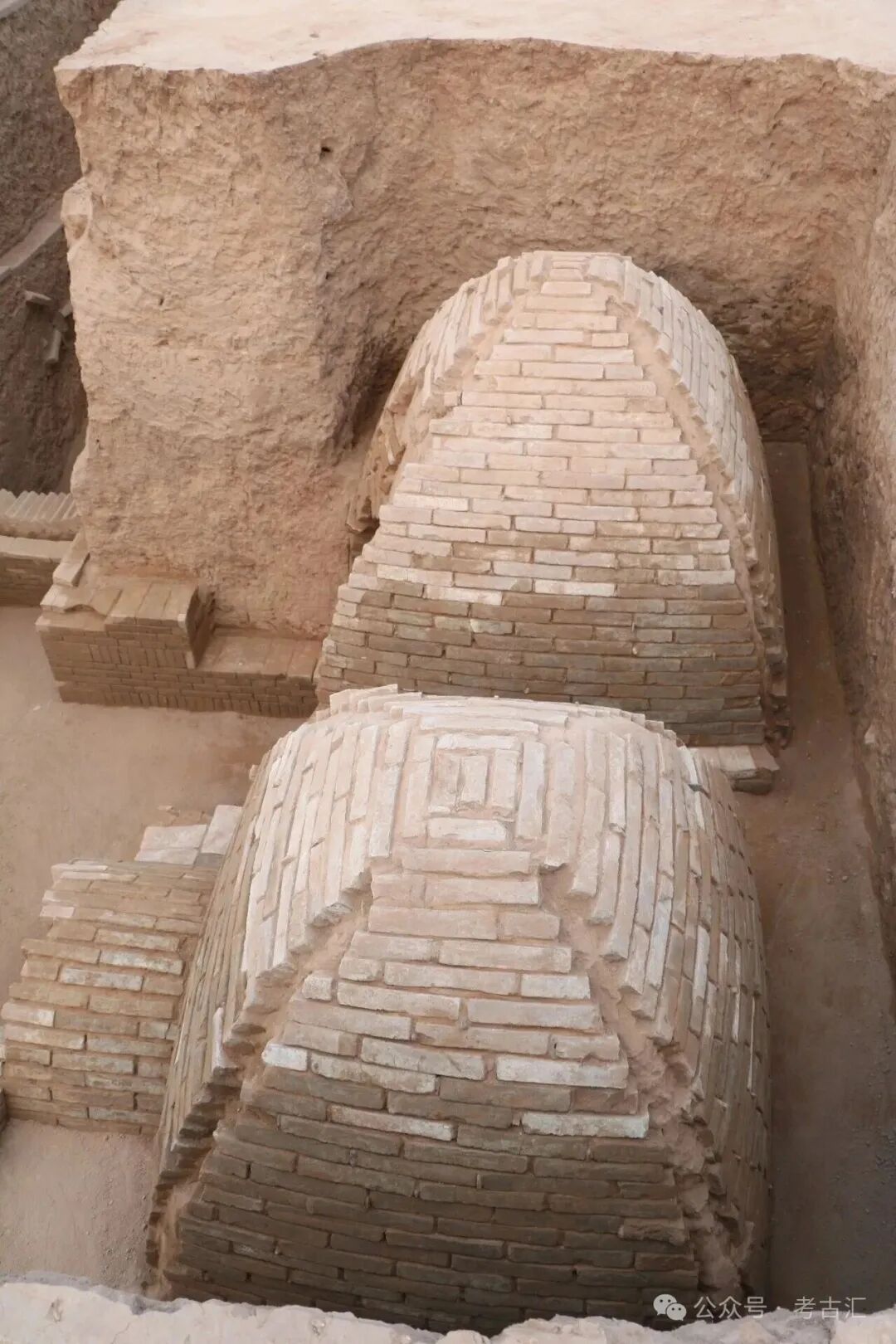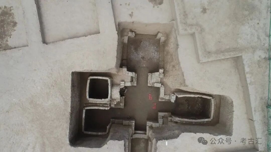 两侧耳室顶部结构均为四隅券进式穹窿顶,呈弧边、弧壁,其铺底砖先顺向错缝平砌四层条形砖,之上竖向丁砖一层,此类组合共三组,之上再顺向错缝平砌条形砖至顶。南侧双耳室其整体墓壁面垂直、粗糙,局部显露明显工具痕迹,类似铁镢,东、南壁均发现打破早期灰坑。南侧双耳室西耳室长1.78米,宽1.76米,高2.8米,甬道进深0.72米,甬道拱券顶与前室连接处遭到破坏,其顶部保存较为完整,未遭明显破坏。出土随葬品有长条形铜刀残段、泥质灰陶陶灯一件、陶灶一件,均残,保存情况较差。
