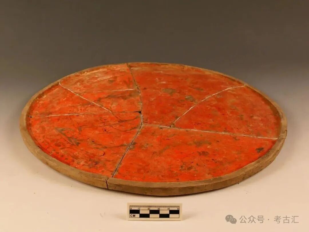 M2开口于②层下,开口距现地表0.32米~0.45米,呈东西向,由墓道、墓室、耳室组成,墓道位于墓室东端,呈长条形,该墓打破③层(文化层),方向东偏北104度,墓道长约18.3米,宽1.96米,墓道壁及底部较平整,斜坡墓道,最深处约3.84米,有踩踏硬面。墓道由西向东依次被M3、M4打破北壁,被K1、M5打破南壁;墓道底部近墓门封门前有“人”字形交错平铺的条形砖作为铺底砖,其宽1.36米,长1米。该墓前后室遭破坏严重,其残长7.22米,残宽3.4米,仅存残断墙体及转角部分,砖室内有大量砖缺失,推测被后期人为拆毁。前室西北端出土红色彩绘陶盘一件,保存情况一般。铺底砖东部底面有近似不完整的长条状黑色印痕,呈东西向,推测该后室置棺三具,破坏程度极其严重,棺、人骨、随葬品残片所剩无几,后室甬道近底部填土内出土部分陶灶、陶魁、陶奁残片和一枚“五铢”铜钱,后室口处出土彩绘陶盘、彩绘陶盆残片。