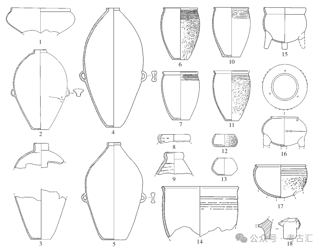 1.鼓腹罐(H34:3) 2~5、8、9.小口瓶(F3:33、H15:22、F3:34、H15:5、H35:9、H34:4) 6、7、10、11.深腹罐(H35:2、F3:40、F3:25、F3:24) 12、13.盂(F3:3、F3:74) 14.敞口罐(H15:28) 15~17.鼎(F3:18、F3:17、H15:15) 18.鼎足(H34:2)