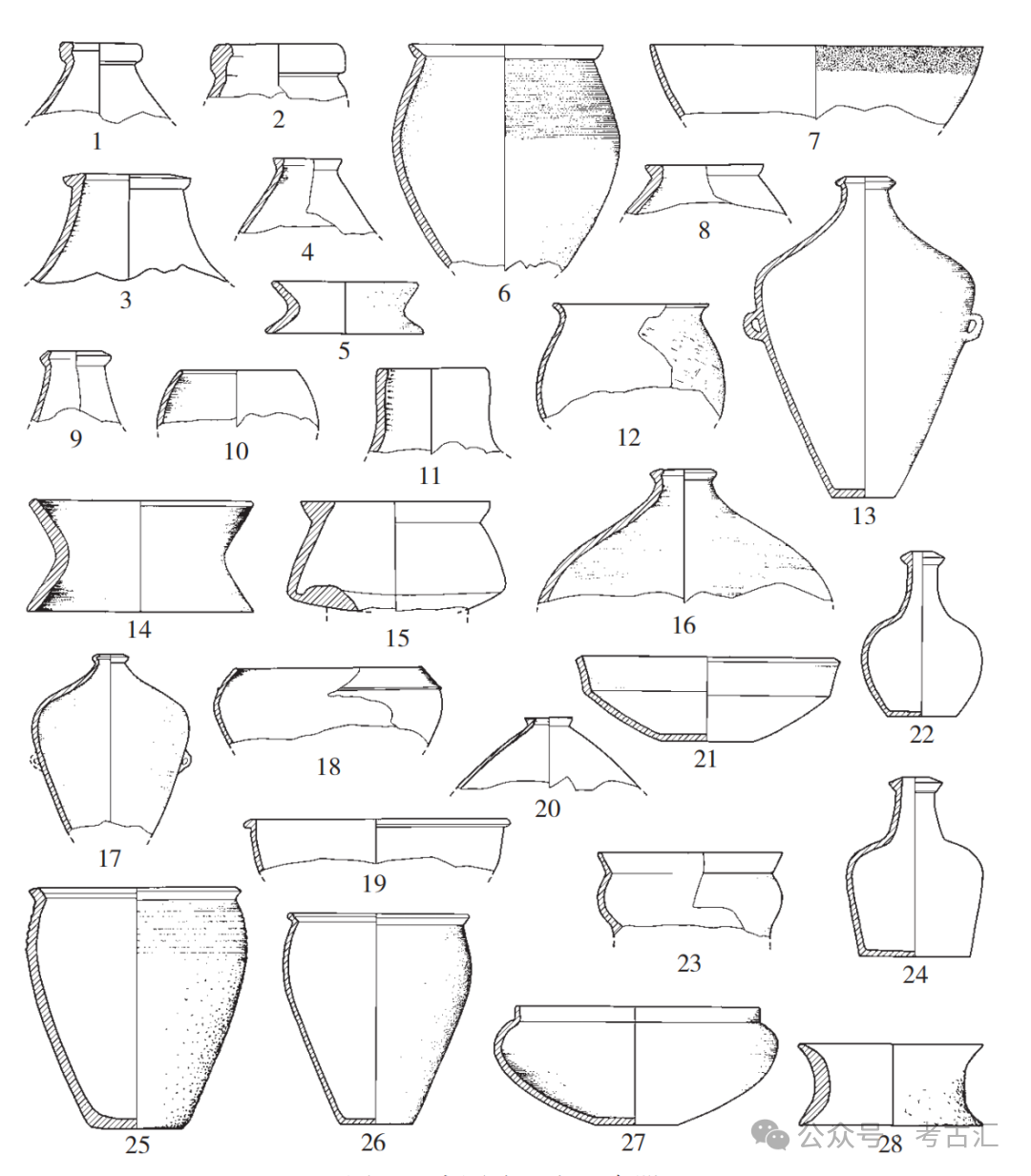 1~3、7、8、10.小口壶(T3②:6、T3②:8、T9③:3、T1②:2、T8③:3、F1:85) 4~6、9.瓶(ⅣG11:14、ⅣG3:33、ⅣH40:191、ⅣF3:21) 11.小口瓶(H15:22) 12~14.蒜头壶(ⅣH40:194、F1:44、F1:43) 15、16.侈口鼓腹罐(T2②:1、T7③:2) 17、19、20.深腹罐(F3:40、ⅣH79:1、ⅣH40:154) 18.鼓腹罐(F1:39) 21.折沿鼓腹罐(H1:73) 22.筒腹罐(ⅣG3:55) 23~25、27.盂(ⅣH40:137、ⅣH40:184、ⅣG13:45、ⅣG3:27) 26、28.器座(ⅣG13:62、ⅣG3:5) (1~3、7、8、10、13~16、18、21出自枣园遗址,4~6、9、12、19、20、22~28出自东关遗址,11、17出自荒坡遗址)