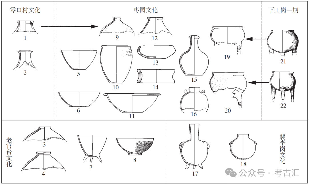 图六 枣园文化与零口村、下王岗一期、老官台、裴李岗文化部分典型陶器的对比