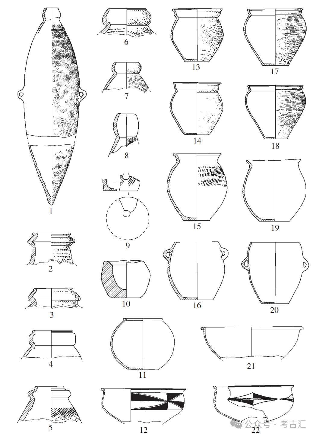 1~8.尖底瓶(H113:1:7、H32:8、ⅡT1302④:6、H116:2:16、H117:1:1、H32:15、H32:14、H117:1:8) 9.镂孔器(H116:2:17) 10.小碗(H116:2:14) 11.敛口罐(H113:1:4) 12、22.彩陶盆(H109:4:13、H124:1:13) 13、14、17、18.敞口罐(H32:25、采H2:2、H32:26、F2:3) 15、19.侈沿罐(H113:1:1、H117:1:6) 16、20.双耳罐(H113:1:2、H113:1:3) 21.折沿盆(H116:2:15) (2、3、6、7、13、14、17、18出自北橄遗址,其余出自东庄村遗址)