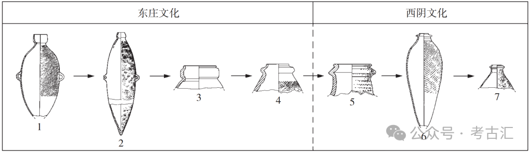 东庄村H117属东庄文化、北橄H32属西阴文化的认识,从陶小口尖底瓶的角度完善了晋南豫西地区由东庄文化到西阴文化的演变序列。通过对南交口、东庄、北橄等遗址的分析,可以窥视出东庄文化至西阴文化早期小口尖底瓶的演变过程(图九)。北橄H32:8类尖底瓶(图九,5)的出现,标志着至迟在北橄第二期遗存时期,晋南地区的东庄文化已发展为西阴文化。