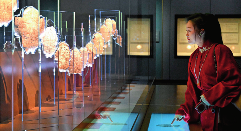 参观者在河南安阳殷墟博物馆新馆内观看展出的刻辞卜甲(2024 年 2 月 26 日摄) 李安摄 / 本刊