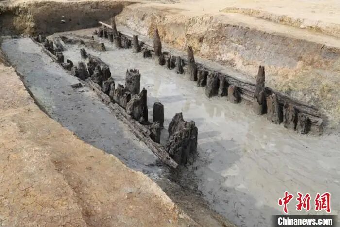 湖北郢城遗址东门发现木构桥梁遗存。 彭巍 摄