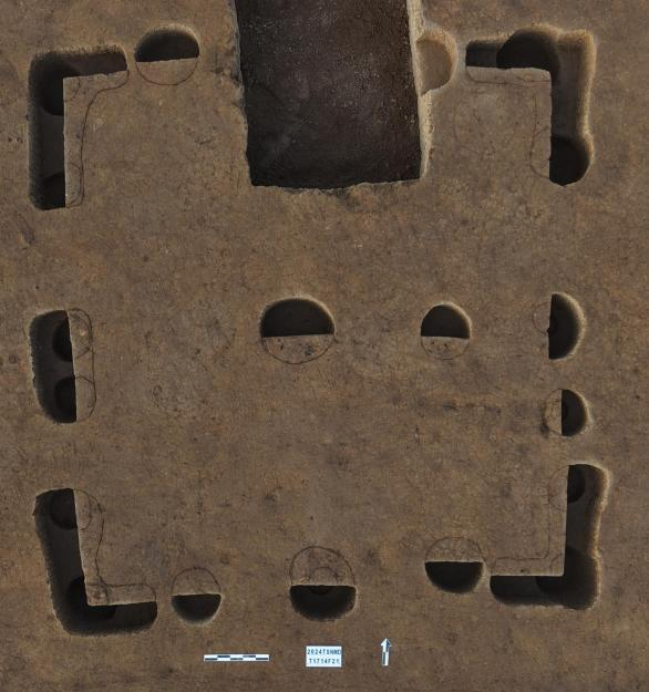 本次发掘的大汶口房址可分为半地穴式和地面柱洞式两种。房址集中分布在该遗迹的核心区域。半地穴式房址具有保温、隔热、防风等优点,适合当时的气候条件,同时挖地穴的土可就地用作糊墙、屋面,减少土方运输量,具有方便实用的特点。地面柱洞式房址具有通风、防潮等优点,更适合大汶口中晚期气候转暖湿润的环境。当时居住方式由半地穴式房址转为地面柱洞式房址,展现了先民在适应环境、技术创新上的卓越能力。