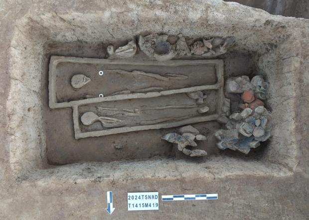 典型墓葬举例:M419双人合葬墓保存较好,土坑竖穴,开口①层下,东西向,墓向86度,墓圹平面形状呈近长方形 ,直壁平底,长255厘米、宽140厘米至150厘米、深70厘米。墓室内置木质双棺,棺木腐蚀严重,仅残存棺痕,北侧棺痕长176厘米、宽39厘米,残高8厘米;南侧棺痕长203厘米、宽34厘米至60厘米、残高8厘米;板灰厚2厘米至4厘米。葬式均为仰身直肢,头向东。出土玉璧2件、石锛1件、石环1件、石器1件、陶器1件、陶鼎4件、陶罐3件、陶纺轮1件、陶豆2件、陶壶1件等。