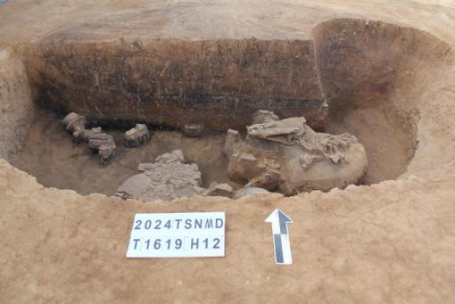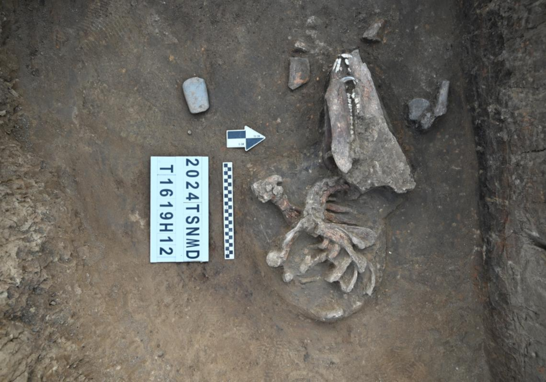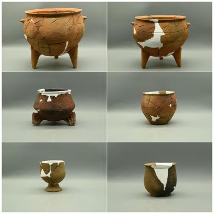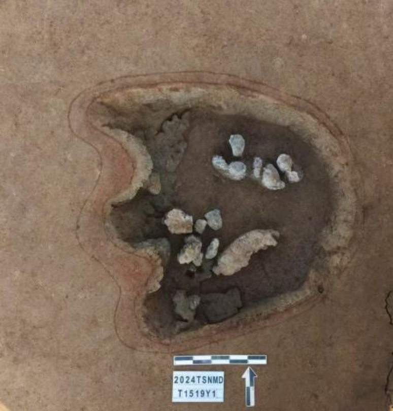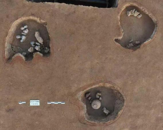 如H12,开口最大径232厘米、底部最大径244厘米、深66厘米;坑内有火烧痕迹,并清理出较为完整的猪上半身骨架,猪骨亦经过火烧,并且出土较多陶器,目前已修复陶鼎3件、有领大罐1件、石斧1件,初步推测H12应为一处祭祀类遗存。