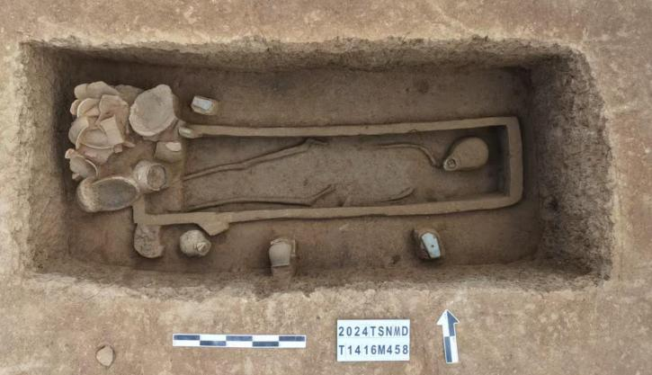 M458单人墓保存较好,土坑竖穴,开口①层下,东西向,墓向88度,墓圹平面形状呈长方形 ,直壁,平底,长226厘米、宽100厘米、深67厘米。墓室内置木质单棺,棺木腐蚀严重,仅残存棺痕,棺痕长186厘米、宽48厘米、残高18厘米、板灰厚2厘米至5厘米;仰身直肢,头向东。出土石锛1件、石斧1件、砺石1件、陶簋1件、陶鼎3件、陶罐3件、镂孔豆2件、陶豆1件等。