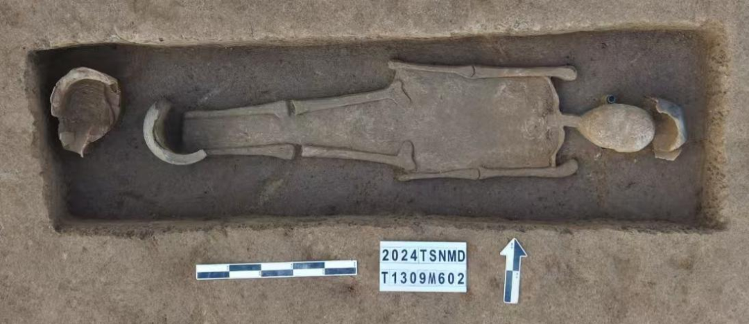 M602单人墓,土坑竖穴,开口①层下,东西向,墓向82度,墓圹平面形状呈近长方形 ,直壁平底,长210厘米、宽60厘米至70厘米、残深18厘米。墓圹内未发现葬具,在人骨头部及脚部均有陶器残片覆盖,推测为特殊葬俗(瓮棺葬);葬式为仰身直肢,头向东。出土耳珰2件,背壶1件,陶罐1件。