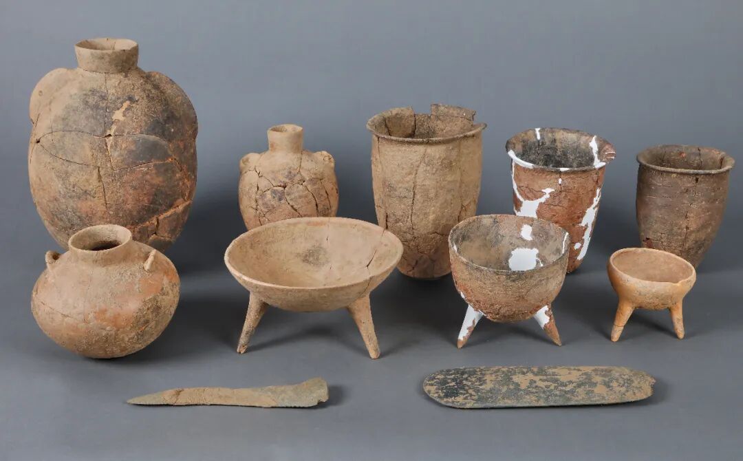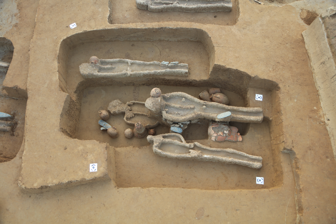 两个墓区尚未完全揭露,其空间关系仍待确认。总体葬式葬俗较为一致,竖穴土坑墓,南向,仰身直肢,陶壶多置于头西侧,已形成稳定的葬俗。西部墓葬核心区墓圹普遍较大,部分墓葬随葬品丰富,壶、深腹罐、三足钵等陶器多成组出土,另一般多见石磨盘、磨棒、陶鼎、绿松石等,反映出一定程度的社会分化。