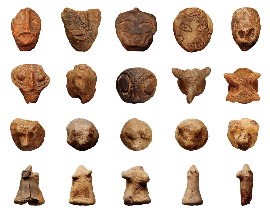 生活区出土陶塑以人物和动物头像为主题,精细者采用浮雕、刻划等技法,底部多穿孔;简约者以捏塑成形。部分人面陶塑具有明显面具化特征,其中“介”字形冠人面獠牙像为探索史前神人形象起源提供了重要材料。