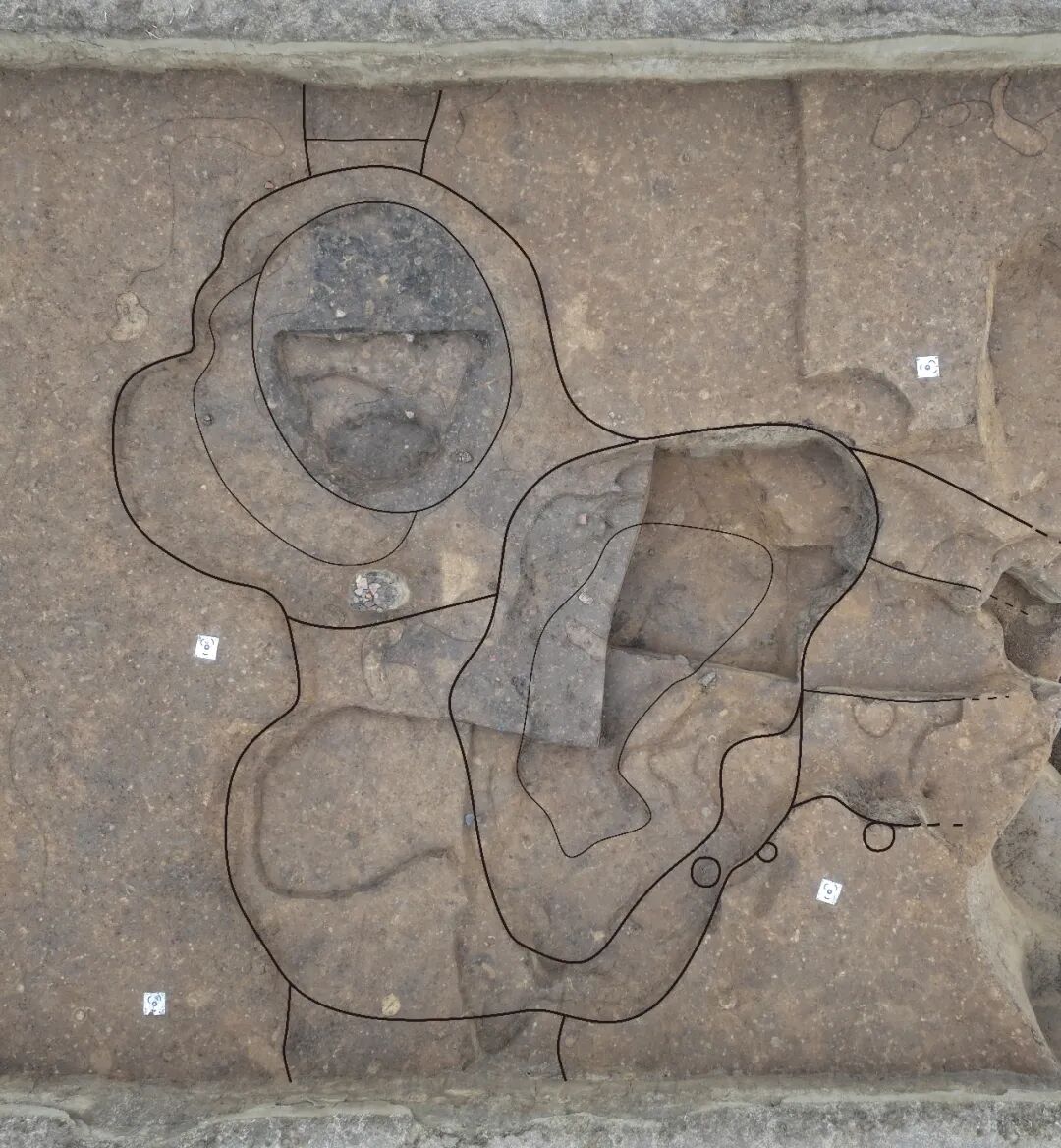 生活区以房址、灰坑和陶窑为基本单元,成组分布于遗址东北、东南、西南及西部。