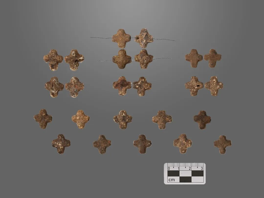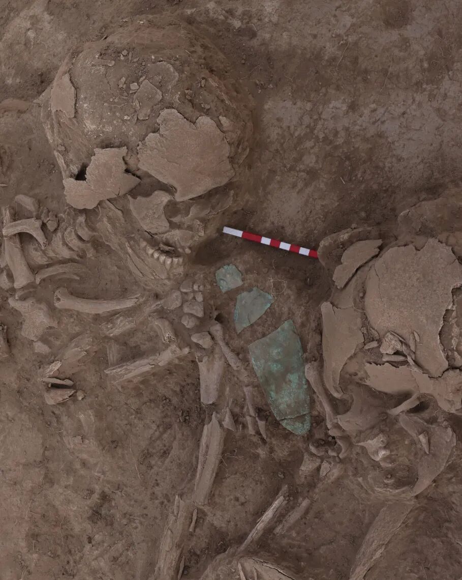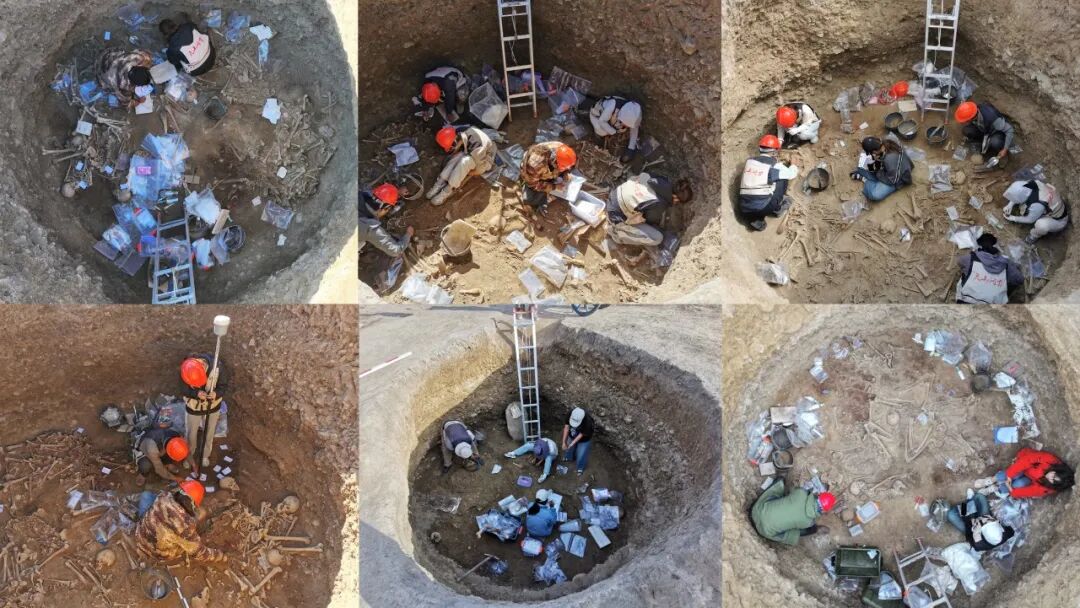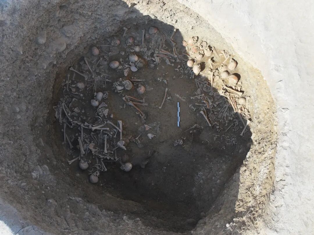 发掘表明,Z1主墓内人骨有因多次埋葬而产生的扰乱现象。2024年,田野工作人员与人类学家全程合作、精细发掘,复原了主墓的埋葬、扰动过程,这有利于最大限度地对人骨进行拼对、整合(目前已确认主墓内人骨最大个体数120例;成年个体最小个体数41例,未成年人个体最小个体数12例;较完整的成年个体18例,较完整的未成年人个体6例;成年人及未成年人颅骨共50例),进行骨骼形态和病理研究。这也为下一步进行系统性古基因组学研究,全面解析主墓中120例个体的复杂社会结构和亲缘网络,奠定了坚实的技术基础和材料保障(图十九、二十)。