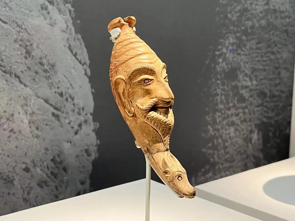 人首牛头陶饮器,它出土于和田约特干遗址。在使用时从上方注酒,从下方牛嘴处出酒,和西方的来通杯用法相同。来通杯可以用来代替和模拟牺牲祭祀,也作为饮酒器来使用,并与酒神崇拜结合在一起。因为必须要一饮而尽,故而人们在宴饮时会用它来纵酒狂欢。