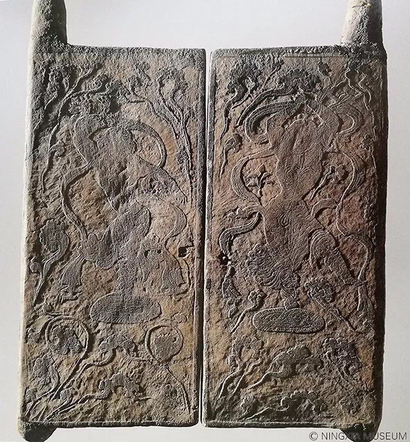 胡旋舞石刻墓门是1985年出土于宁夏盐池县苏步井乡窨子梁唐墓的石刻文物,现藏于宁夏博物馆。该墓门由两扇闭合石门构成,单扇尺寸长89厘米、宽43厘米、厚5厘米,闭合处设有铁锁扣接,门面采用减地浅浮雕技法刻画两名男性胡人舞者,双人足踏圆毯挥巾起舞,四周饰以卷云纹浮雕。浮雕舞者身着圆领紧身窄袖衫与长筒皮靴,呈现前脚掌着地的旋转姿态,其造型与《新唐书》所载中亚传入的胡旋舞特征相符。墓主系中亚粟特何国人氏,卒于唐武周久视元年(公元700年),印证唐代灵州地区作为昭武九姓聚居地的史实。该文物为唐代墓葬首次发现的胡旋舞主题石刻,1996年被认定为国宝级文物,揭示了丝绸之路上的文化交流与民族融合。