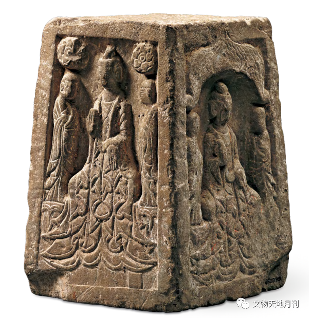 摘要: 北魏 佛、弟子石造佛塔 北魏佛、弟子石造佛塔,1996年隆德县神林乡出土,宁夏固原博物馆馆藏。红沙岩石质。整体为梯形,四面开龛造像,其中相对两龛平顶,左右上角分别雕有莲花装饰,另相对两龛均为火焰纹拱形龛。四龛造像均为一佛二弟子,中佛高发髻,结跏趺坐,弟子站立两侧。其中两佛龛佛作说法印,另两佛龛佛施禅定印。佛面相清秀,高肉髻 ...