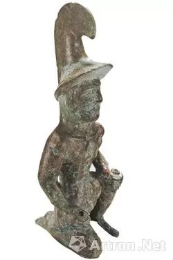 而类似这样的青铜武士像,在伊犁草原乃至欧亚草原上,并非只有一件。无独有偶,1999年在巩留县境内,也发现一件青铜武士像,虽说其头上戴着尖顶弯钩宽檐帽,但仅保存了上身及头部。有意思的是,两件青铜武士像的手上,似乎都握着什么东西,是火把还是兵器,不得而知。虽说从巩留县出土的这件青铜武士像表现的是乌孙人的形象,不过,新疆考古专家从他头戴尖顶弯钩宽檐帽的特点上看,认为它更像是古希腊比利乌斯雅典娜像上的铜冠,应该也是塞人。