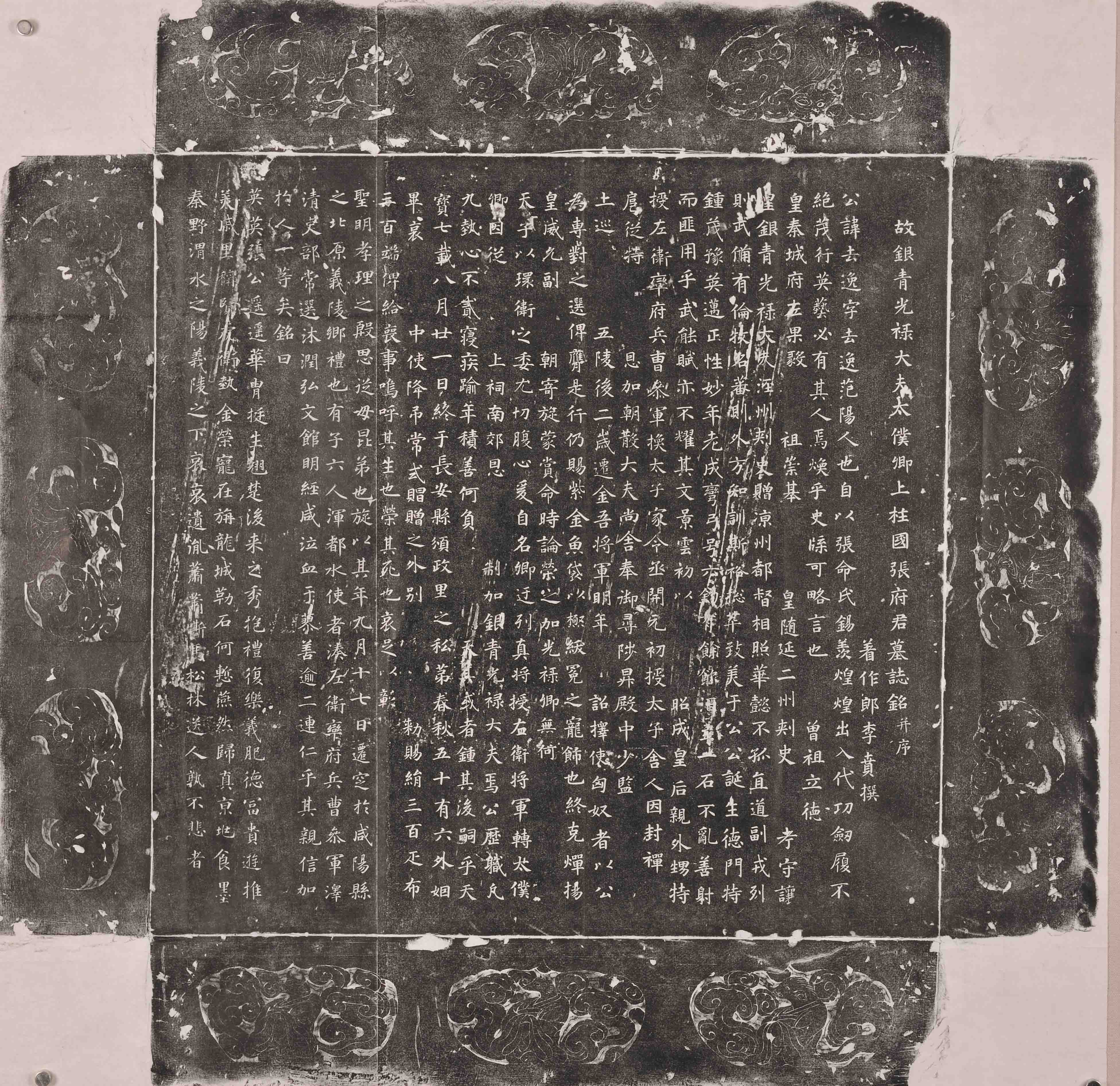 张去逸墓志刻作于唐天宝七载(748年)九月十七日,1953年出土于陕西省咸阳市底张湾。该墓志由李贲撰文,采用正书书写,志文共27行,每行27字;志盖刻有4行文字,每行4字。墓志四侧刻有青龙、白虎、朱雀、玄武四神图案。