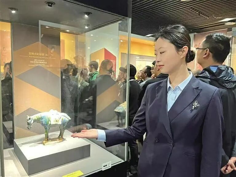 “我们面前的蓝釉点彩驮骡是唐三彩中少见的精品。”11月6日,在西安博物院第二展厅,讲解员张萌向游客讲解。