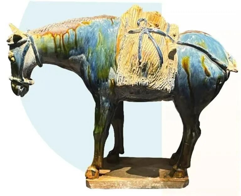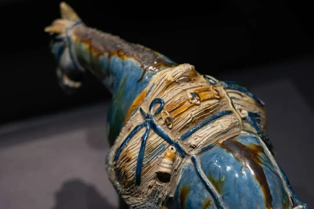 蓝釉点彩驮骡与三彩腾空马在烧制中都采用了珍贵的蓝色釉料,还运用了中国传统陶瓷的“点彩”技术。两者的结合,使得这两件文物在唐三彩中别具一格。