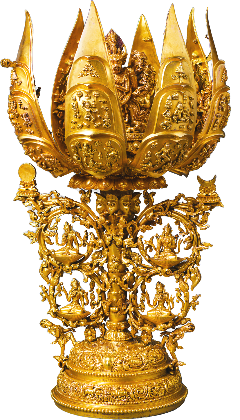 摘要: 八瓣莲花大威德金刚曼陀罗,是明代宫廷中汉藏艺术文化交融的典型,其特殊的设计和精湛的工艺足以令世人瞩目。整体为铜铸鎏金工艺,其顶盖安装在两个对应花瓣的小耳上,一对耳柄起到枢轴作用。当花蕾关闭时,顶盖会覆盖花瓣的上端,同时顶盖的其他部分将花尖束成花蕾。无论是开合设计还是铸造技艺,都堪称一绝。花瓣打开后,里面蕴藏着一个佛国世界。花蕊和 ...