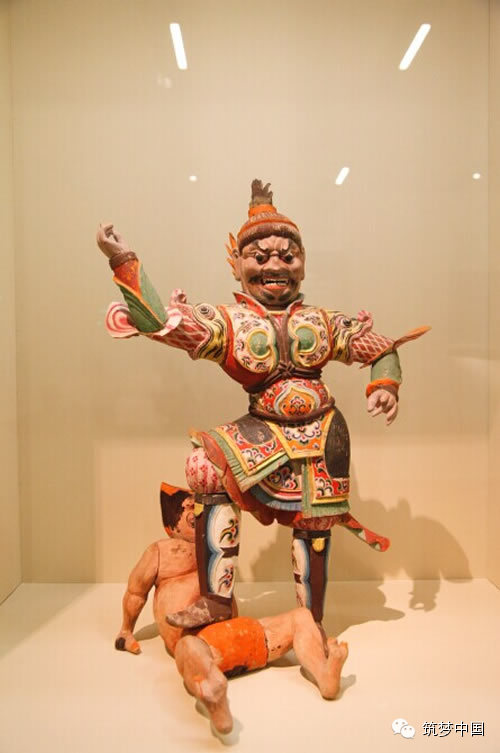 通高86厘米,由30余块柏木分段雕刻、粘合后敷彩而成,工艺极其精巧,连牙齿都可单独取下。