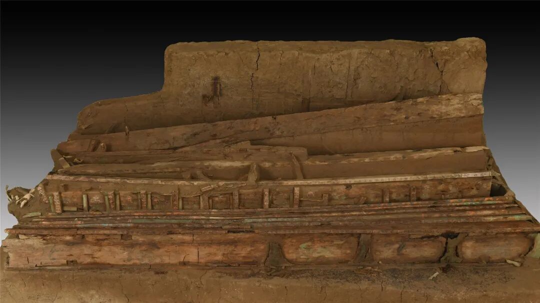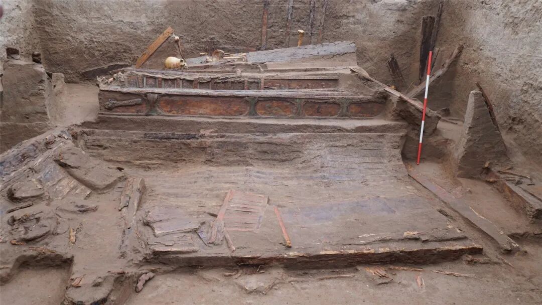 墓内陈设布局由彩绘木榻、木棺、木架、木箱、木屏风五部分组成,为国内首次发现。这种陈设布局既融合了中原礼制以及西域本地文化中的精神意象,生动体现了中华文明多元一体、兼收并蓄的鲜明特征。木榻上摆放案几、木盘、笔架和陶质箕形砚,模拟前厅生活工作、后寝安息的生前行为模式,是典型“前堂后寝”的设计理念,再现“事死如事生”的丧葬观。